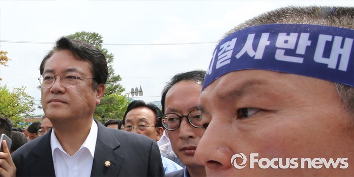 (성주=포커스뉴스) 26일 오전 경북 성주군청을 찾은 정신석 새누리당 원내대표와 지도부들이 성주군민들과 간담회를 갖기 위해 군청으로 이동하고 있다.