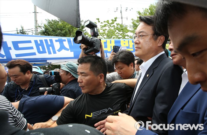 (성주=포커스뉴스) 26일 오전 경북 성주군청을 찾은 정신석 새누리당 원내대표와 지도부들이 성주군민들과 간담회를 마치고 군청을 나와 버스로 이동하고 있다.