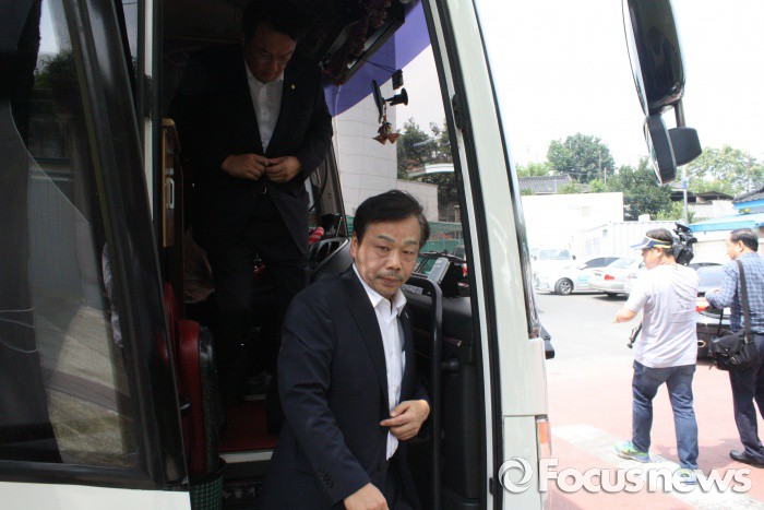 (성주=포커스뉴스) 26일 오전 새누리당이 경북 성주군청 후문으로 버스에서 하차하고 있다.
