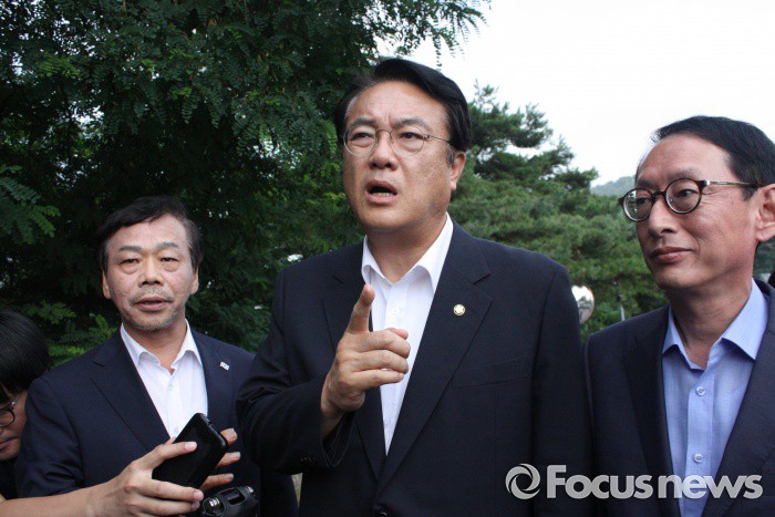 (성주=포커스뉴스) 26일 오전 경북 성주 성산포대를 찾은 정진석 새누리당 원내대표(중간)와 지도부들이 성산포대 입구를 바라보며 이야기를 나누고 있다.