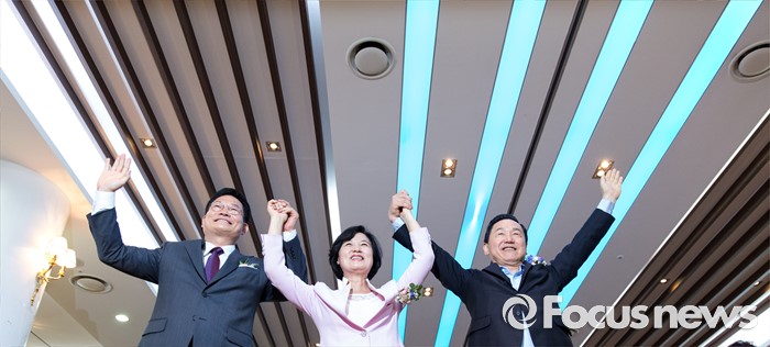 (서울=포커스뉴스) 26일 오후 서울 서초구 엘루체에서 열린 더불어민주당 서울특별시당 서초갑 정기지역대의원대회에서 전당대회 출마를 선언한 송영길(왼쪽부터) 의원과 추미애 의원, 김상곤 의원이 만세삼창을 하고 있다.