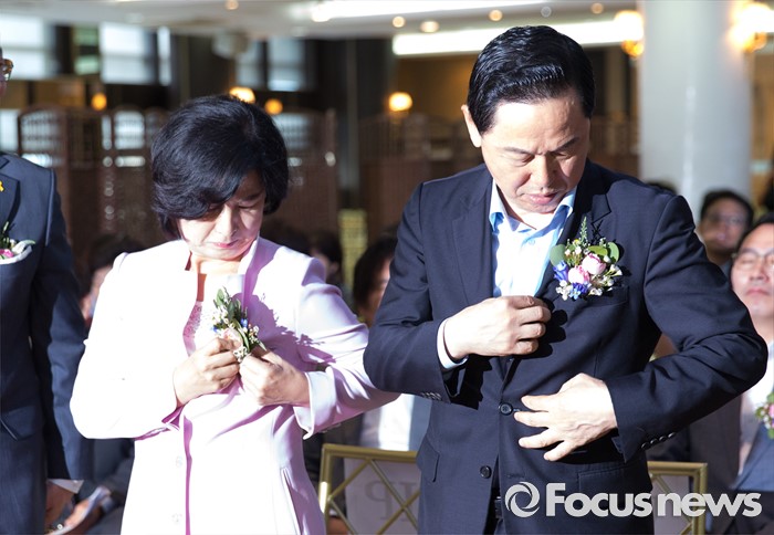 (서울=포커스뉴스) 26일 오후 서울 서초구 엘루체에서 열린 더불어민주당 서울특별시당 서초갑 정기지역대의원대회에서 전당대회 출마를 선언한 추미애(왼쪽) 의원과 김상곤 의원이 가슴에 꽃을 고쳐 매고 있다
