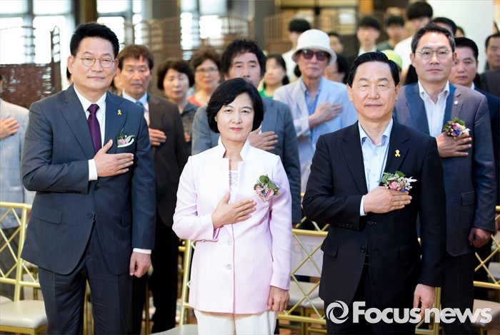 (서울=포커스뉴스) 26일 오후 서울 서초구 엘루체에서 열린 더불어민주당 서울특별시당 서초갑 정기지역대의원대회에서 전당대회 출마를 선언한 송영길(왼쪽부터) 의원과 추미애 의원, 김상곤 의원이 국민의례를 하고 있다.