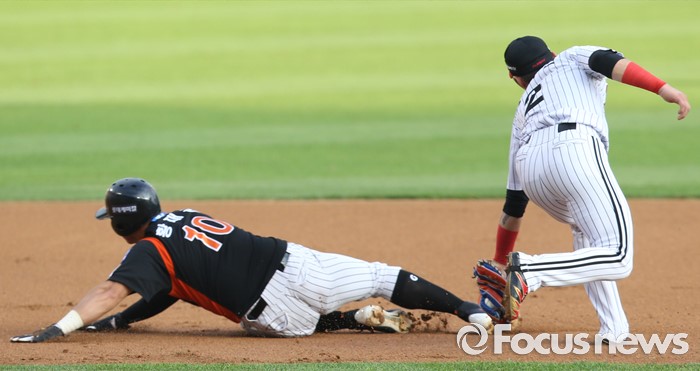 (서울=포커스뉴스) 26일 서울 잠실구장에서 열린 2016 프로야구 롯데-LG 경기 1회초 1사 1,3루에서 롯데 강민호의 유격수앞 땅볼때 협살에 걸린 2루주자 황재균이 LG 오지환의 태그를 피하고 있다.