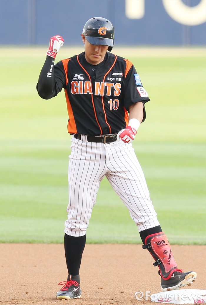 (서울=포커스뉴스) 26일 서울 잠실구장에서 열린 2016 프로야구 롯데-LG 경기 1회초 1사 1,2루에서 롯데 황재균이 좌익수 왼쪽으로 빠지는 1타점 2루타를 치고 2루에서 기뻐하고 있다.