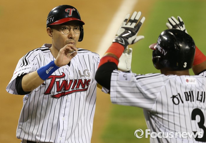 (서울=포커스뉴스) 26일 서울 잠실구장에서 열린 2016 프로야구 롯데-LG 경기 5회말 1사 2루에서 LG 정성훈이 우중간 홈런을 치고 선행주자 히메네스의 환영을 받으며 홈인하고 있다.