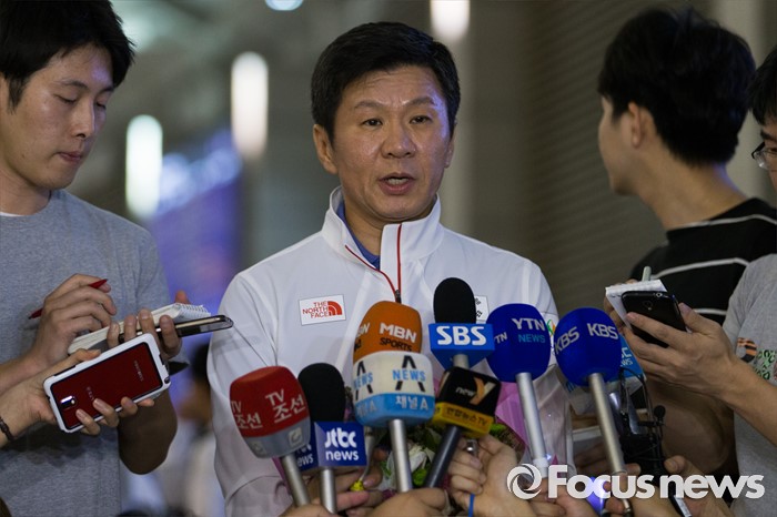 (인천공항=포커스뉴스) 남미에서 최초로 열리는 제31회 브라질 리우데자네이루 하계올림픽 대한민국 선수단을 이끄는 정몽규 선수단장이 26일 오후 인천국제공항에서 출국 전 취재진 질문에 답변하고 있다.