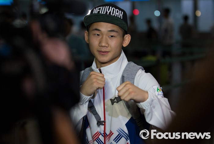 (인천공항=포커스뉴스) 남미에서 최초로 열리는 제31회 브라질 리우데자네이루 하계올림픽에 참가하는 함상명 대한민국 복싱 국가대표팀 선수가 26일 오후 인천국제공항에서 인터뷰 중 복싱 포즈를 취하고 있다.