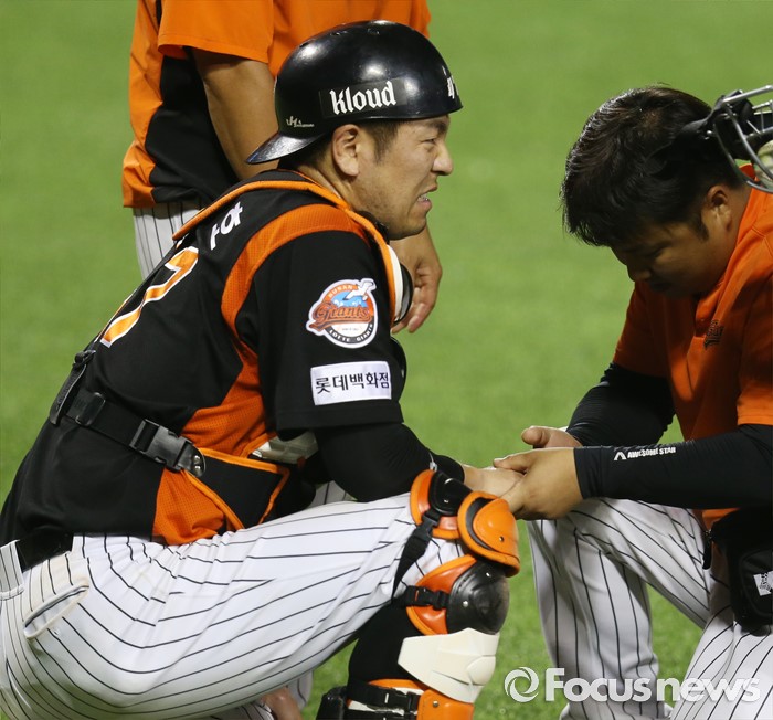 | △ 유강남을 막다 다친 롯데 포수 강민호 |