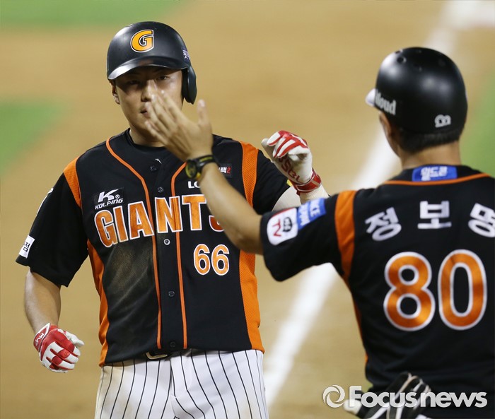 (서울=포커스뉴스) 26일 서울 잠실구장에서 열린 2016 프로야구 롯데-LG 경기 8회초 롯데 선두타자 김상호가 좌중월 홈런을 치고 정보명 코치의 환영을 받으며 홈인하고 있다.