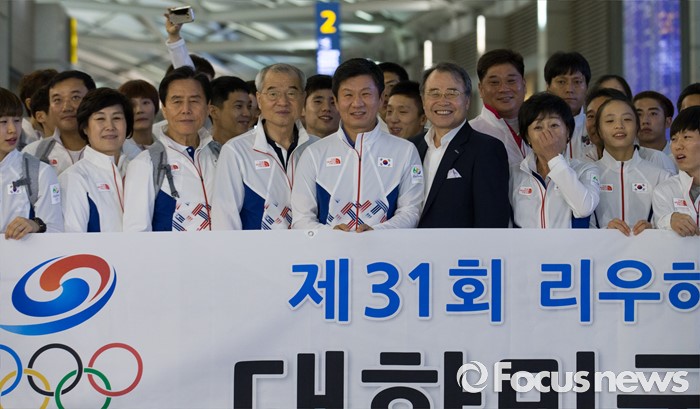 (인천공항=포커스뉴스) 남미에서 최초로 열리는 제31회 브라질 리우데자네이루 하계올림픽에 참가하는 정몽규 선수단장을 비롯한 대한민국 국가대표팀 선수들이 26일 오후 인천국제공항에서 출국 전 기념촬영을 하고 있다.