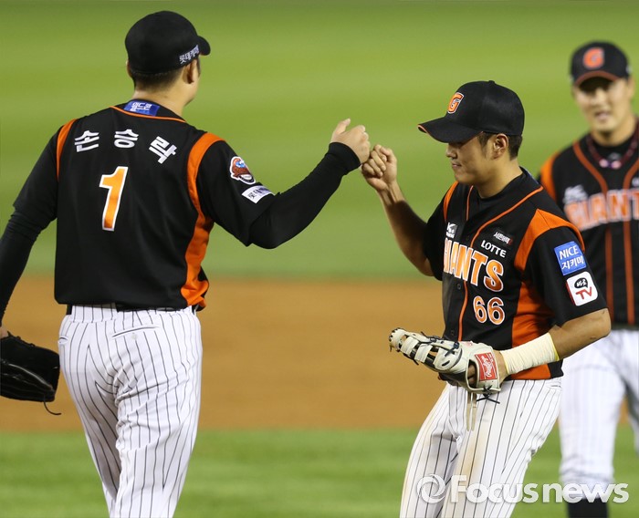(서울=포커스뉴스) 26일 서울 잠실구장에서 열린 2016 프로야구 롯데-LG 경기에서 LG에 12-10으로 2점차 승리한 롯데의 마무리 투수 손승락과 김상호가 주먹을 마주치고 있다.