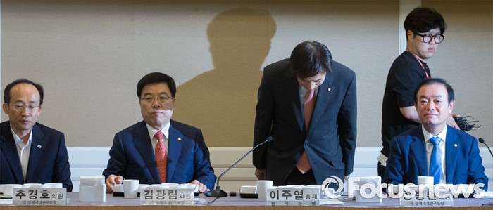 (서울=포커스뉴스) 27일 오전 서울 여의도 국회 귀빈식당에서 열린 경재재정연구포럼 조찬 간담회에 참석한 이주열 한국은행 총재가 인사하고 있다. 왼쪽부터 추경호 새누리당 의원, 김광림 정책위의장, 이주열 한국은행 총재, 장병완 국민의당 의원.