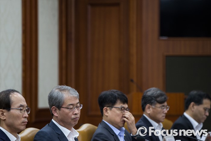 (서울=포커스뉴스) 27일 오전 서울 세종로 정부서울청사에서 열린 경제관계장관회의에 참석한 위원들이 유일호 경제부총리 겸 기획재정부 장관의 모두발언을 듣고 있다. 왼쪽부터 윤성규 환경부 장관, 임종룡 금융위원장, 고영선 고용노동부 차관.