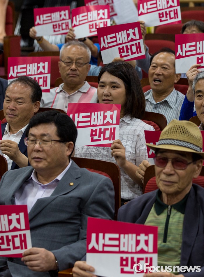 (서울=포커스뉴스) 함세웅(오른쪽 세 번째) 신부를 비롯한 정당인 및 시민단체 관계자들이 27일 오전 서울 여의도 국회의원회관에서 열린 '7.27 사드반대 사회원로-각계 인사 기자회견'에 참석해 사드배치 반대를 촉구하는 구호를 외치고 있다.