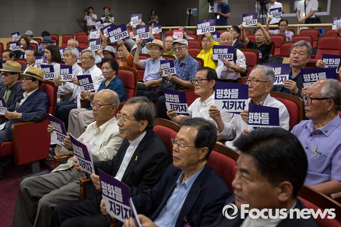 (서울=포커스뉴스) 함세웅(오른쪽 세 번째) 신부를 비롯한 정당인 및 시민단체 관계자들이 27일 오전 서울 여의도 국회의원회관에서 열린 '7.27 사드반대 사회원로-각계 인사 기자회견'에 참석해 사드배치 반대를 촉구하는 구호를 외치고 있다.