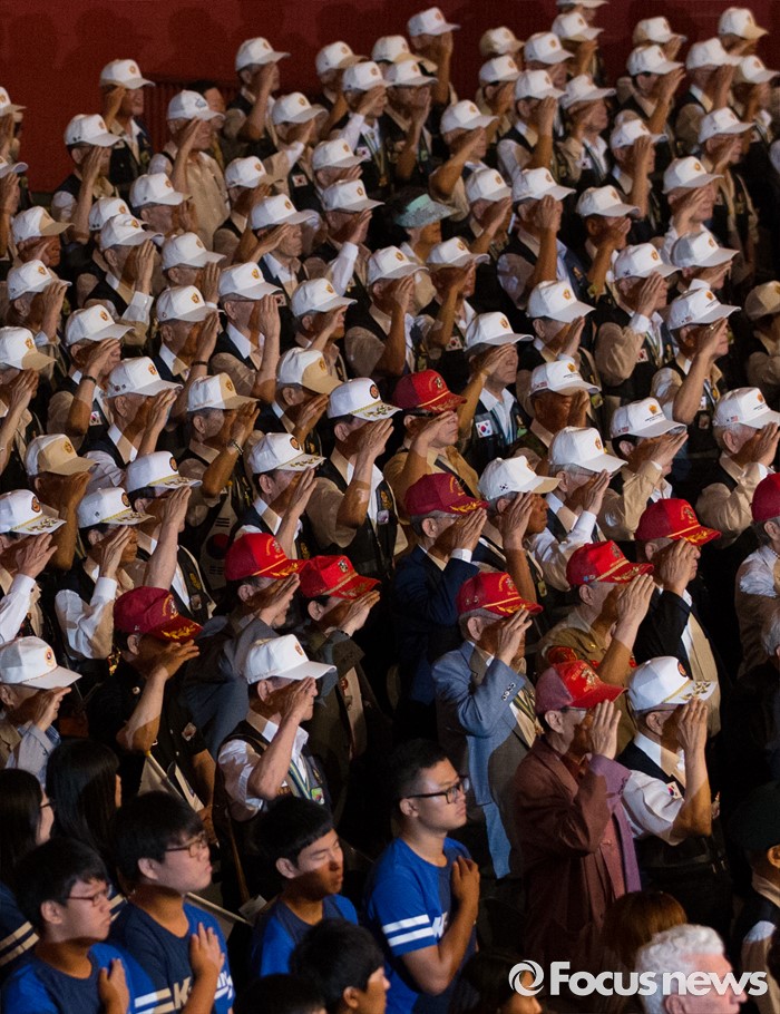 (서울=포커스뉴스) 27일 오전 서울 송파구 올림픽공원 올림픽홀에서 열린 정전협정 63주년 및 유엔군 참전의 날 기념식에서 6·25 전쟁 참전용사들이 국기에 대한 경례를 하고 있다.