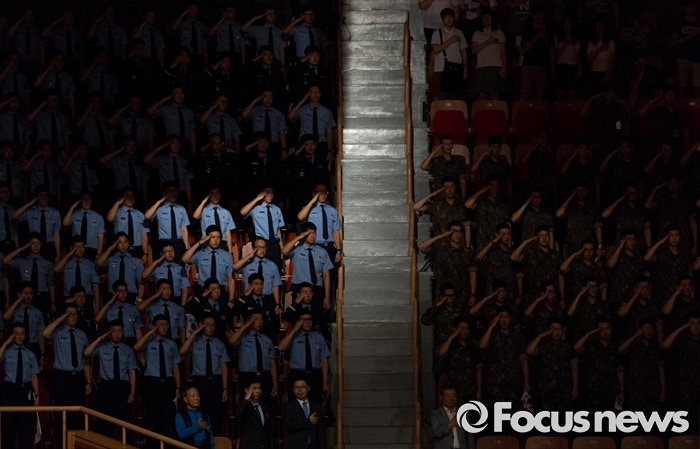(서울=포커스뉴스) 27일 오전 서울 송파구 올림픽공원 올림픽홀에서 열린 정전협정 63주년 및 유엔군 참전의 날 기념식에서 장병들이 국기에 대한 경례를 하고 있다.