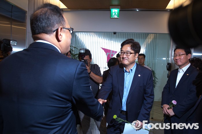 (서울=포커스뉴스) 27일 오전 서울 영등포구 여의도에 위치한 옥시레킷벤키저 본사에서 열린 국회 가습기살균제 국조특위 현장조사에 참석한 우원식 위원장이 아타 샤프달 옥시 대표와 악수를 하고 있다.