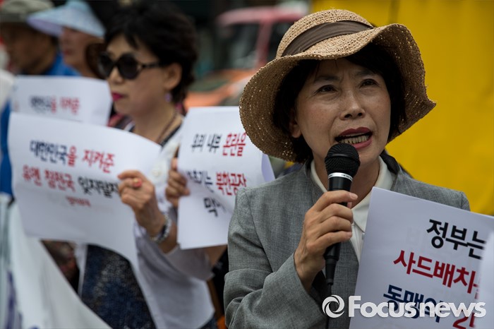 (서울=포커스뉴스) 27일 오전 서울 종로구 광화문광장에서 엄마부대, 나라지키기운동본부 등 4개 단체 회원들이 정전협정 63주년 기자회견을 열고 정부의 사드배치를 촉구하고 있다.