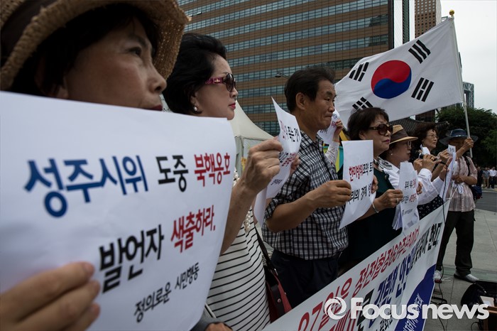 (서울=포커스뉴스) 27일 오전 서울 종로구 광화문광장에서 엄마부대, 나라지키기운동본부 등 4개 단체 회원들이 정전협정 63주년 기자회견을 열고 사드배치를 촉구하고 있다.