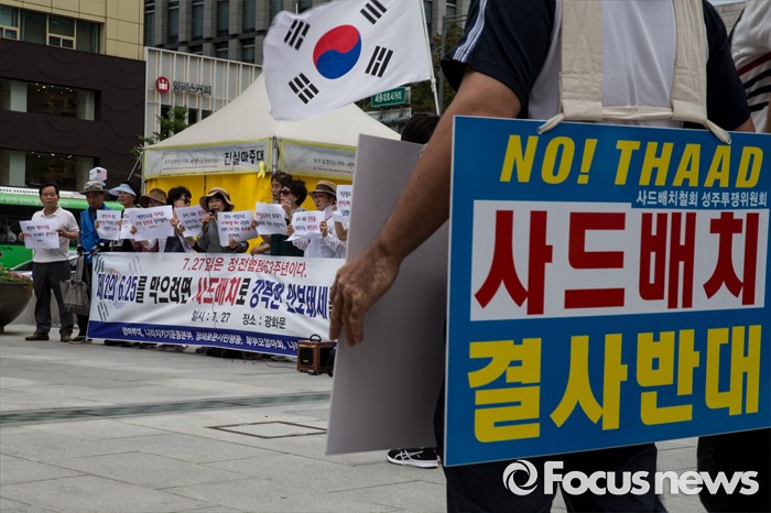 | △ 사드배치 환영 외치는 엄마부대 앞 성주투쟁위원회 |