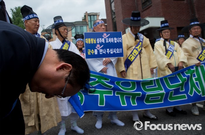 (서울=포커스뉴스) 27일 오전 서울 종로구 청운효자동 주민자치센터 앞에서 열린 '사드 배치 반대 기자회견'에 참석한 청와대 국민소통비서관이 성주 유림단체 회원들을 향해 허리 숙여 인사하고 있다.