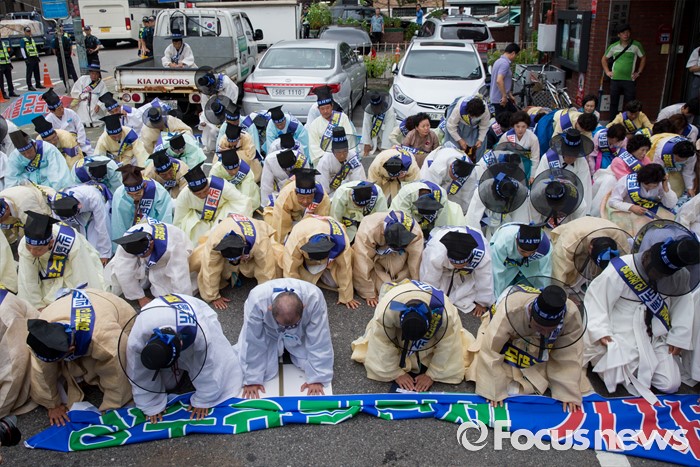 (서울=포커스뉴스) 27일 오전 서울 종로구 청운효자동 주민자치센터 앞에서 열린 '사드 배치 반대 기자회견'에 참석한 성주 유림단체 회원들이 무릎 꿇고 있다.