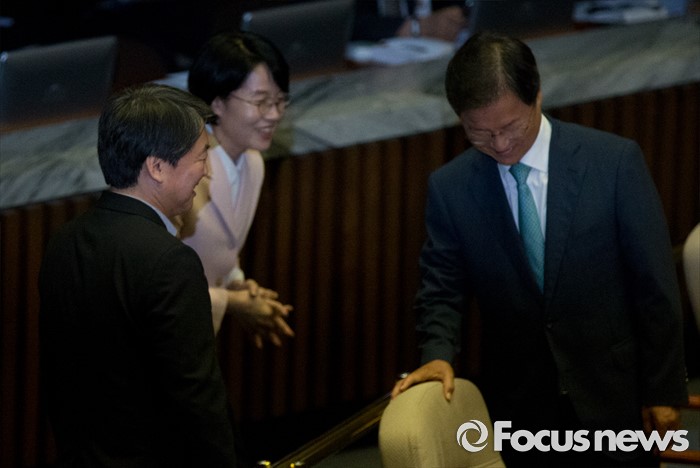 (서울=포커스뉴스) 27일 오후 서울 여의도 국회에서 열린 344회 국회(임시회) 3차 본회의에 참석한 안철수(왼쪽) 국민의당 전 상임공동대표, 천정배(오른쪽) 전 공동대표, 박선숙 의원이 인사하고 있다.