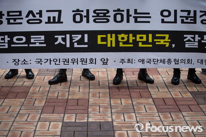(서울=포커스뉴스) 27일 오전 서울 중구 국가인권위 앞에서 고엽제 전우회를 비롯한 보수단체가 국가인권위가 군 동성애를 조장하고 북한 인권에 무관심하다며 시위하고 있다.