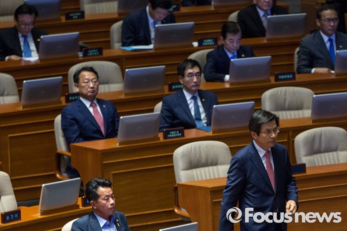 (서울=포커스뉴스) 황교안(오른쪽) 국무총리가 27일 오후 서울 여의도 국회에서 열린 344회 국회(임시회) 3차 본회의에 참석해 추가경정예산안과 관련한 시정연설을 하기 위해 연단으로 향하고 있다.
