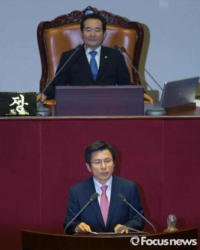 (서울=포커스뉴스) 27일 오후 서울 여의도 국회에서 열린 344회 국회(임시회) 3차 본회의에 참석한 황교안 국무총리가 2016년도 제1회 추가경정예산안에 대한 정부의 시정연설을 하고 있다.