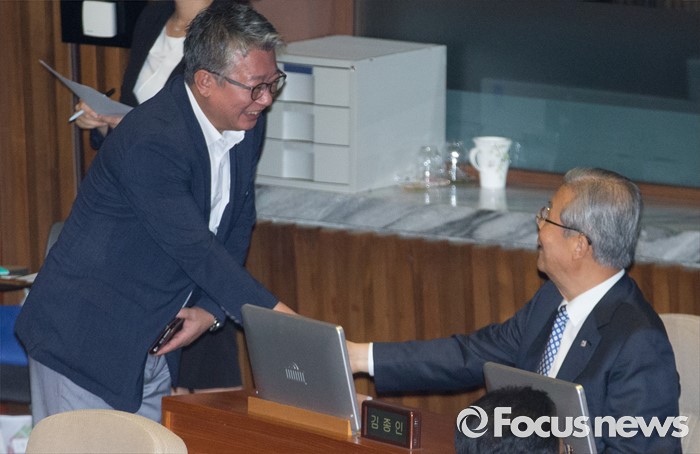 (서울=포커스뉴스) 27일 오후 서울 여의도 국회에서 열린 344회 국회(임시회) 3차 본회의에 참석한 김종인(오른쪽) 더불어민주당 비대위 대표와 조응천 의원이 인사하고 있다.