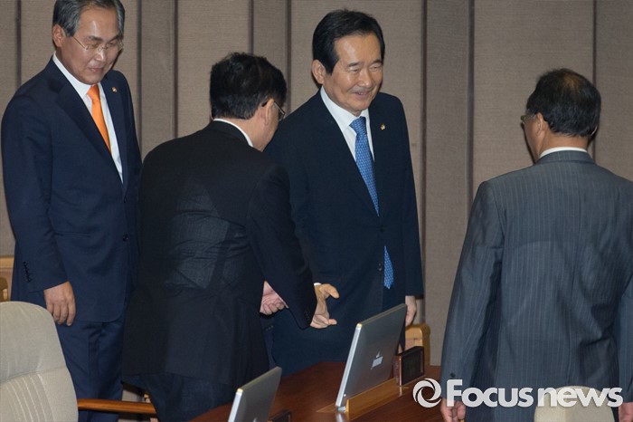 (서울=포커스뉴스) 27일 오후 서울 여의도 국회에서 열린 344회 국회(임시회) 3차 본회의에 참석한 정세균 국회의장이 국무위원들과 인사하고 있다.