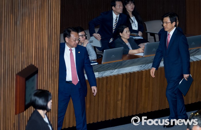 (서울=포커스뉴스) 27일 오후 서울 여의도 국회에서 열린 344회 국회(임시회) 3차 본회의에 참석한 황교안(오른쪽) 국무총리가 추경 시정연설을 마친 뒤 유일호 경제부총리 겸 기획재정부 장관 등 국무위원들과 퇴장하고 있다.