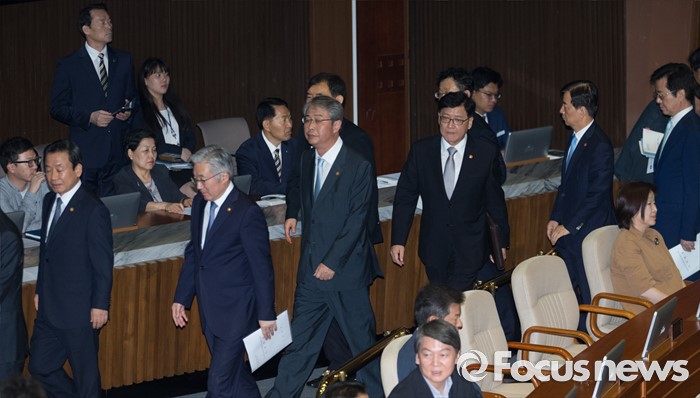 (서울=포커스뉴스) 27일 오후 서울 여의도 국회에서 열린 344회 국회(임시회) 3차 본회의에 참석한 국무위원들이 퇴장하고 있다.