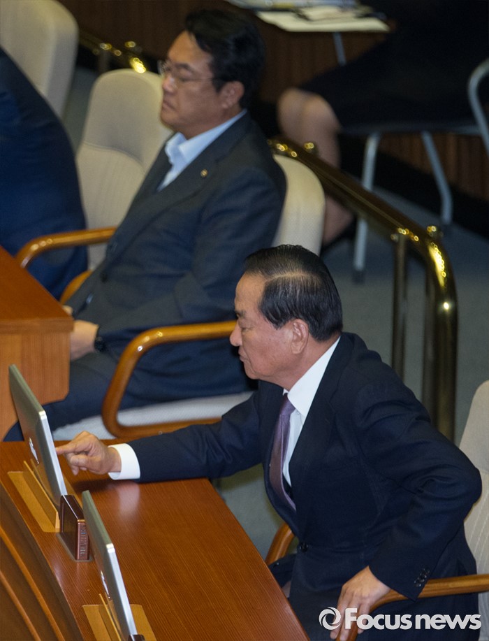 (서울=포커스뉴스) 27일 오후 서울 여의도 국회에서 열린 344회 국회(임시회) 3차 본회의에 정진석(왼쪽) 새누리당 원내대표와 서청원 의원이 자리하고 있다.