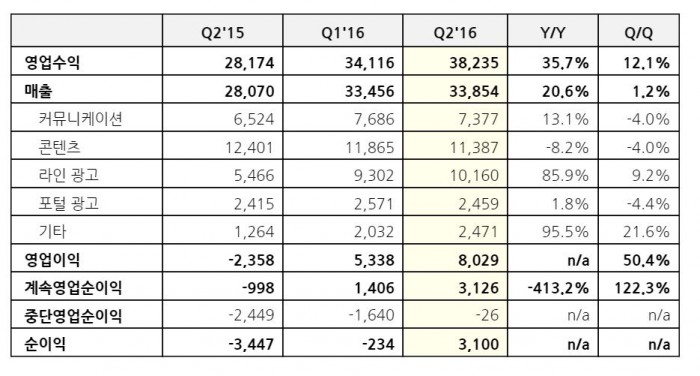 커뮤니케이션 매출은 전분기 대비 4.0% 감소, 전년 동기 대비로는 13.1% 상승했으며, 콘텐츠 매출은 신작 게임 연기 등의 영향으로 전분기 대비 4.0%, 전년 동기 대비 8.2% 감소했다. 전체 광고는 전분기 대비 6.3%, 전년동기 대비 60.1% 상승했다. 이 중 라인 광고 매출은 전분기 대비 9.2%, 전년 동기 대비 85.9% 증가세를 기록했고, 포털 광고 매출은 전분기 대비 4.4% 감소, 전년 동기 대비로는 1.8% 성장했다.