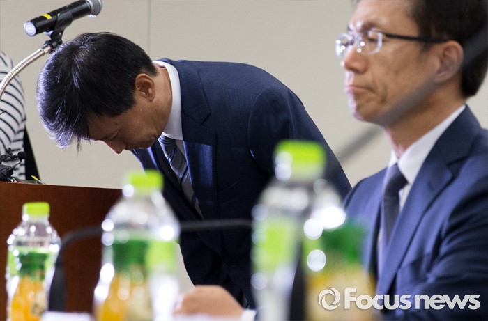 (분당=포커스뉴스) 27일 오후 경기도 성남 분당구 SK케미칼 본사에서 열린 가습기살균제 사고 진상규명과 피해구제 및 재발방지 대책마련을 위한 국정조사특별위원회 현장조사에서 김철(왼쪽) SK케미칼 대표이사가 업무보고를 마치고 인사 하고 있다.