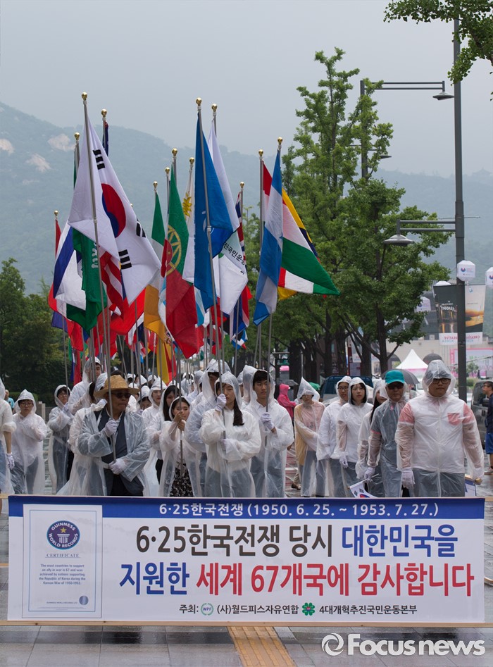 (서울=포커스뉴스) 27일 오후 서울 종로구 세종문화회관 인근에서 월드피스자유연합 관계자들이 6.25전쟁 당시 대한민국 지원 세계 67개국 국기를 들고 퍼레이드를 하고 있다.