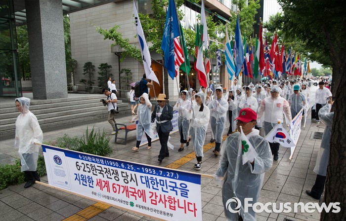 (서울=포커스뉴스) 27일 오후 서울 종로구 세종문화회관 인근에서 월드피스자유연합 관계자들이 6.25전쟁 당시 대한민국 지원 세계 67개국 국기를 들고 퍼레이드를 하고 있다.