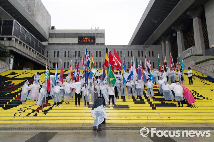 (서울=포커스뉴스) 27일 오후 서울 종로구 세종문화회관 인근에서 월드피스자유연합 관계자들이 6.25전쟁 당시 대한민국 지원 세계 67개국 국기를 들고 퍼레이드 시작 전 정비를 하고 있다.