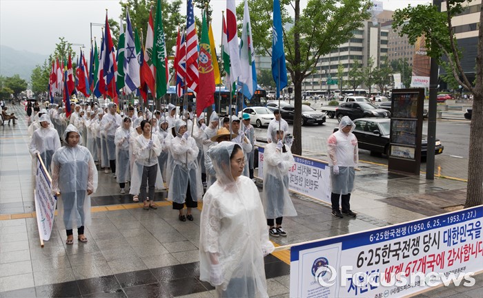 (서울=포커스뉴스) 27일 오후 서울 종로구 세종문화회관 인근에서 월드피스자유연합 관계자들이 6.25전쟁 당시 대한민국 지원 세계 67개국 국기를 들고 퍼레이드를 하고 있다.