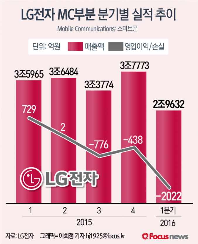 (서울=포커스뉴스) LG전자는 지난 1분기 MC사업부문(Mobile Communications)에서만 2022억원의 적자를 기록했다. LG전자는 MC사업부분에서2015년 3분기 이후 3분기 연속 적자를 냈다.