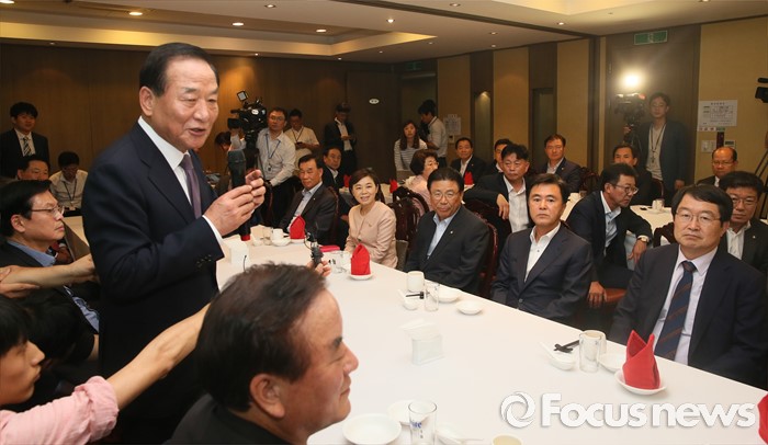(서울=포커스뉴스) 서청원 새누리당 의원이 27일 서울 여의도 한 식당에서 열린 친박(친박근혜)계 의원 만찬회동에서 인사말을 하고 있다.