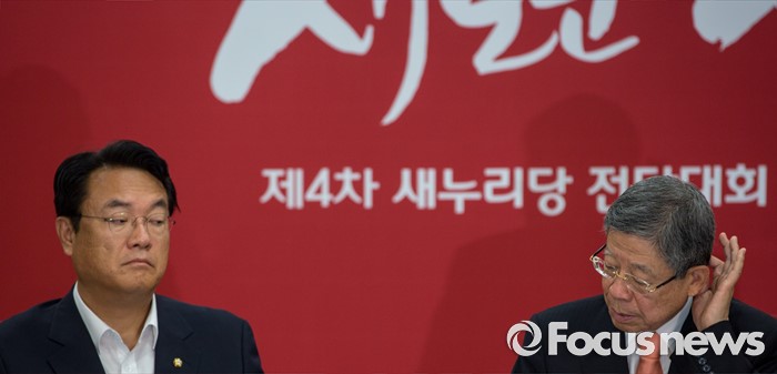 (서울=포커스뉴스) 김희옥(오른쪽) 새누리당 혁신비상대책위원장과 정진석 원내대표가 28일 오전 서울 여의도 새누리당사에서 열린 혁신비상대책위원회의에 참석하고 있다.