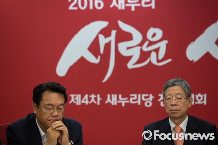 (서울=포커스뉴스) 김희옥(오른쪽) 새누리당 혁신비상대책위원장과 정진석 원내대표가 28일 오전 서울 여의도 새누리당사에서 열린 혁신비상대책위원회의에 참석하 모두발언을 마친 뒤 생각에 잠겨 있다.