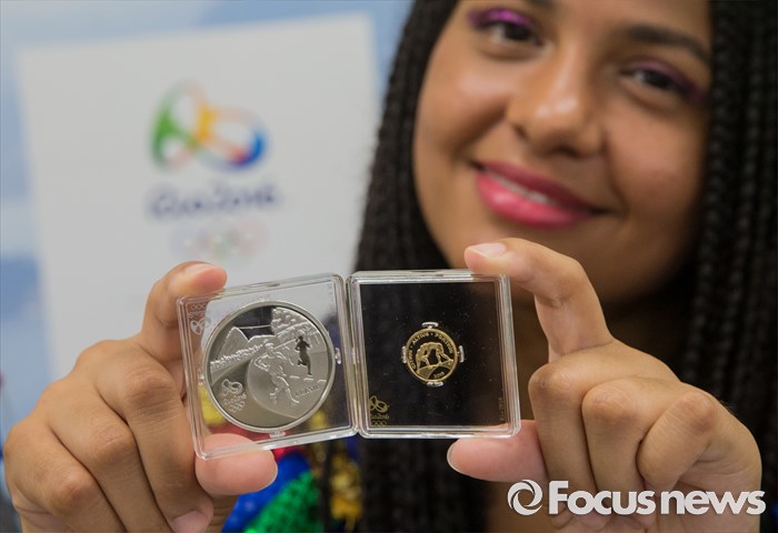 (서울=포커스뉴스) 28일 오전 서울 종로구 주한 브라질대사관에서 현지인 복장의 대사관 직원이 '2016 리우 올림픽 기념주화'를 선보이고 있다.