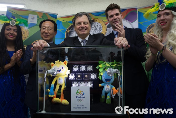 (서울=포커스뉴스) 28일 오전 서울 종로구 주한 브라질대사관에서 루이스 페르난도 세하(가운데) 주한 브라질 대사가 '2016 리우 올림픽 기념주화'를 공개하고 있다.