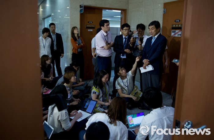 (서울=포커스뉴스) 이종걸 더불어민주당 의원이 28일 오전 서울 여의도 국회에서 전당대회 당대표 출마 기자회견을 마친 뒤 취재진 질문에 답하고 있다.